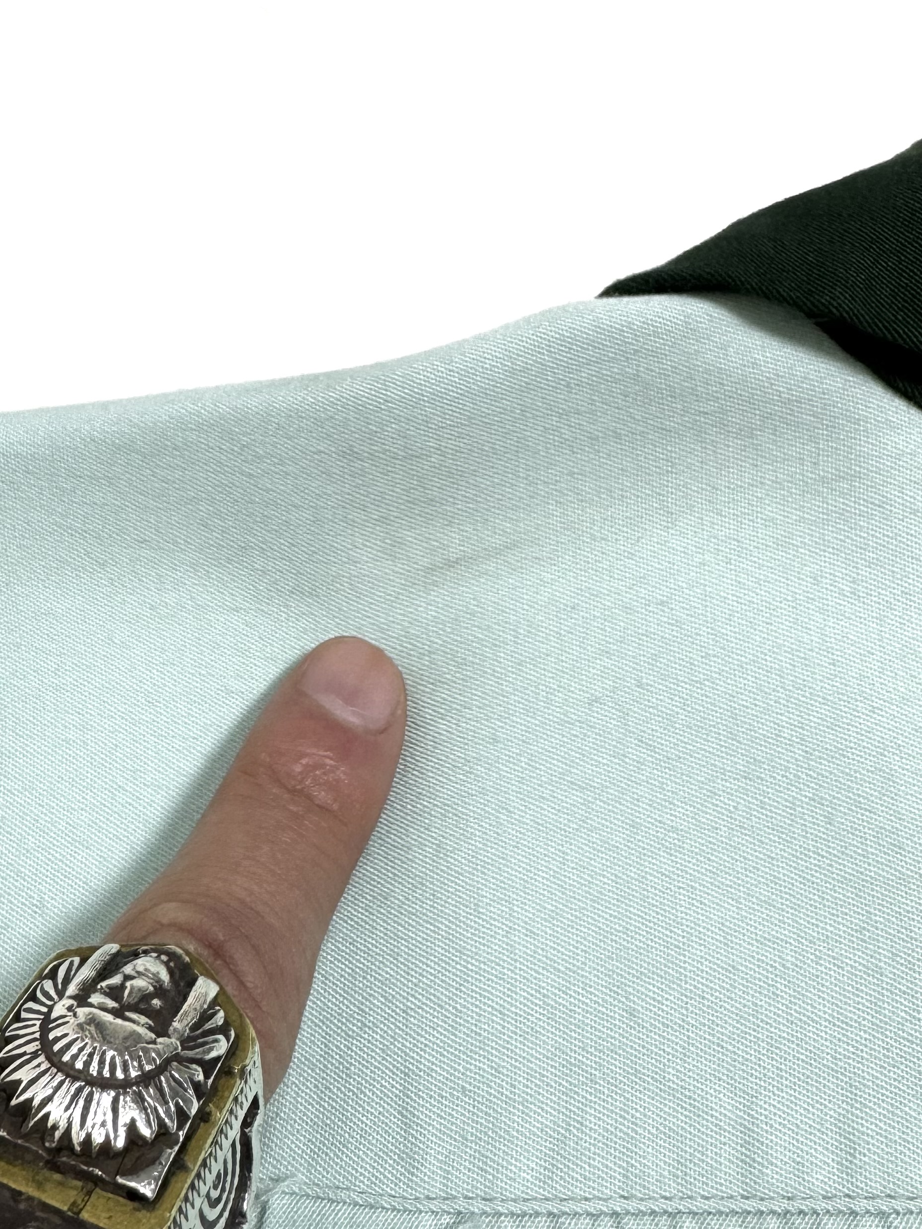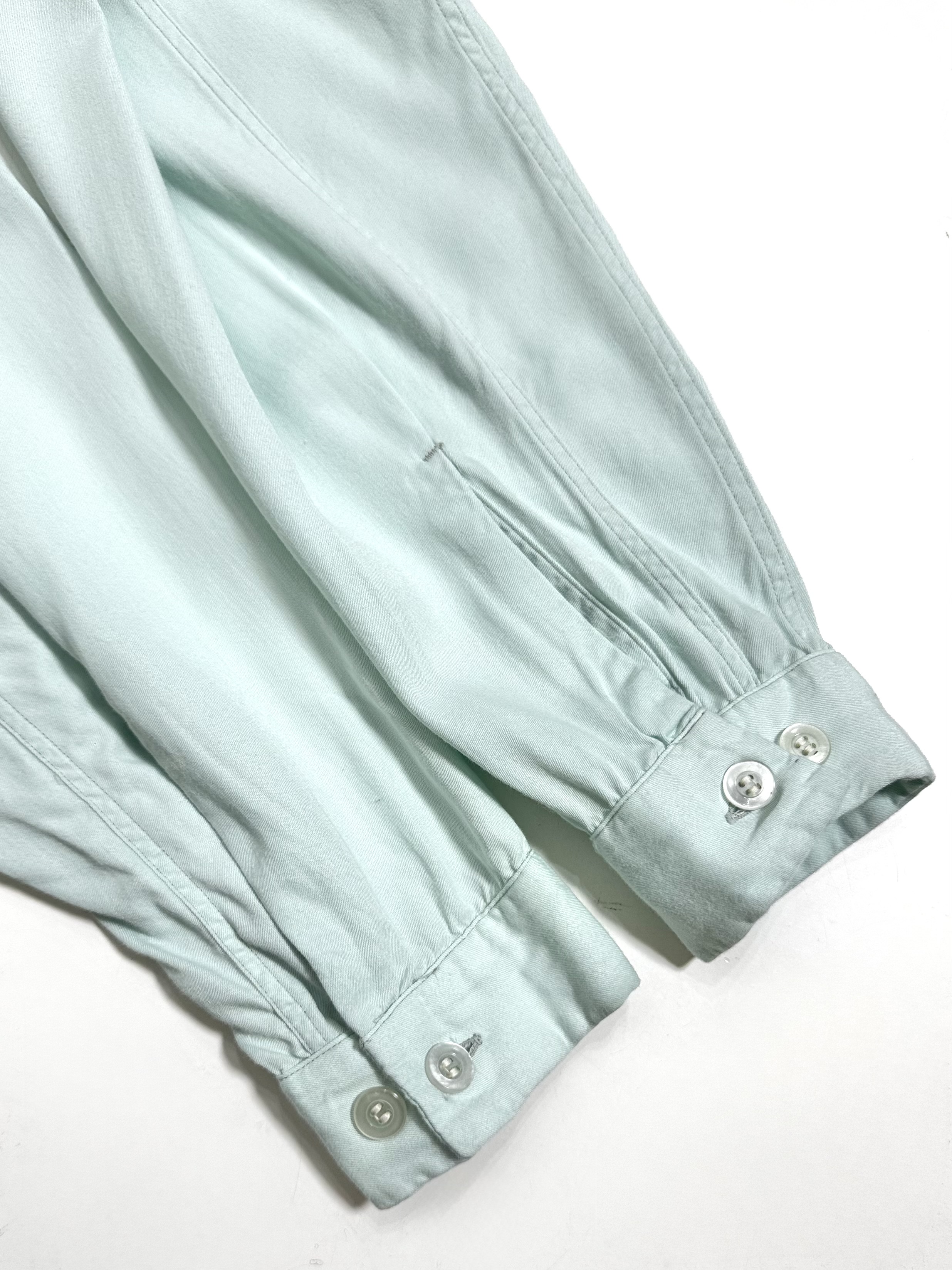 襟は袋襟でトップボタンはループ留めの開襟です。